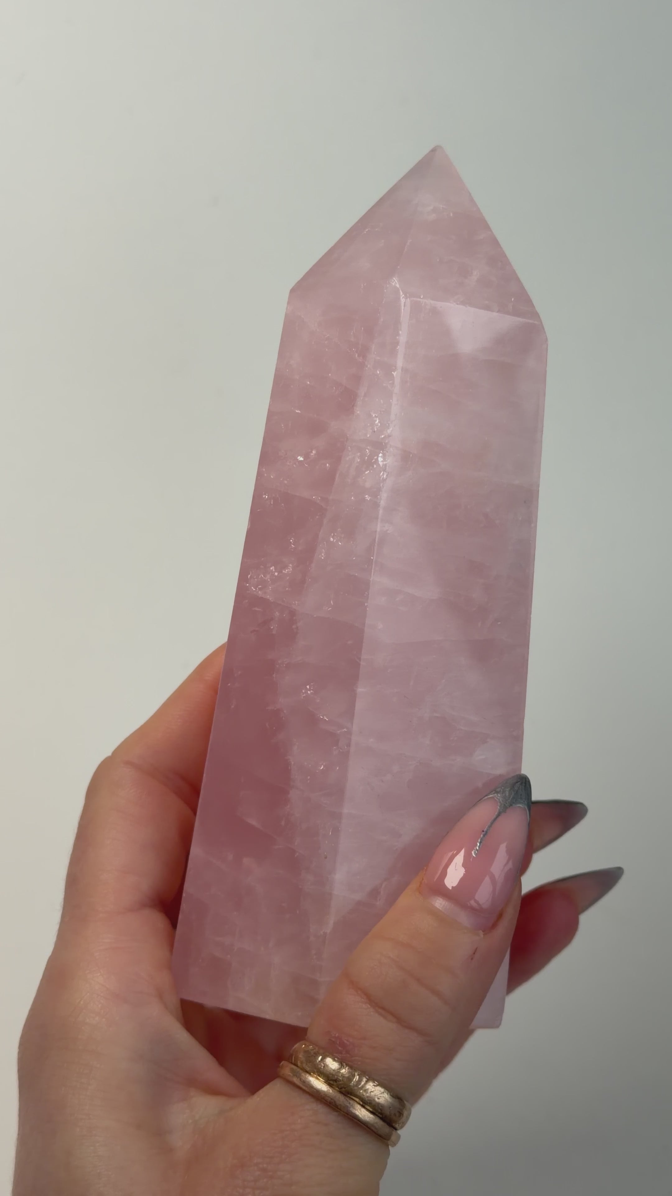 Rose Quartz is a pink variety of Quartz. As the molten rock cools over millions of years, impurities such as titanium, iron, or manganese become trapped in the crystal lattice, creating its characteristic pink colour. Giving it its soft blush tone and gentle translucency. Rose Quartz does not terminate like Quartz does, so this tower has been polished smooth to create a statement tower, enhancing the crystals beauty.